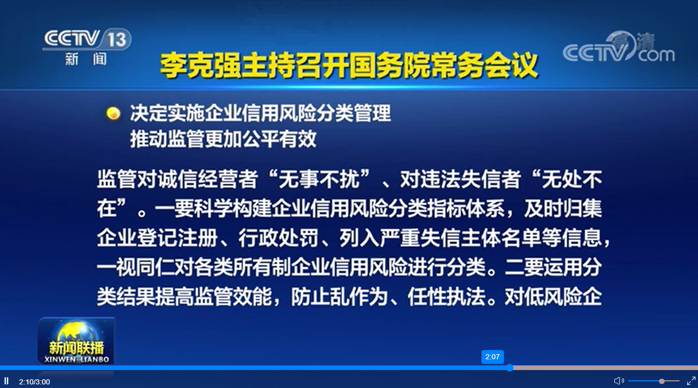 會議指出,信用是市場經濟的基礎。為營造誠實守信、公平競爭市場環境,要依法依規推進企業信用風險分類管理,相應采取“雙隨機、一公開”等科學精準的監管措施,使監管對誠信經營者“無事不擾”、對違法失信者“無處不在”。
